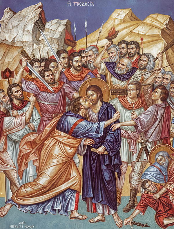 Ипак, до једне тачке, његови поступци су сасвим разумљиви. Одлучивши да изда Христа, Јуда одлази првосвештеницима и поставља питање: „Шта ћете ми дати ако вам Га предам?“ Они му понудише тридесет сребрника, и од тог тренутка он је вребао згодну прилику да изврши своју издају. Прилика се указа већ следеће ноћи. Јуда предводи наоружану групу војника и слугу првосвештеника у Гетсимански врт, место где су Христос и апостоли обично проводили ноћ. „Тада им онај који га је издао даде знак, рекавши: Кога пољубим, онај је; држите га. И одмах приступи Исусу и рече: Здраво, учитељу. И пољуби га. А Исус му рече: Пријатељу, зашто си дошао?“