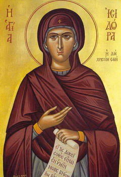 Света реподобна Исидора Јуродива У Тавениском женском манастиру, у Тиваиди, бејаше међу осталим сестрама и једна девица, по имену Исидора. Она Бога ради беше узела на себе подвиг јуродства и понашаше се као луда. Зато је све сестре толико презираху, да ни једна од њих није хтела ни да једе са њом. Све су је понижавале, вређале и грдиле, но она је све то ћутке и с благодарношћу подносила. Исидора је стално радила у кујни, а трудила се и у осталим послушањима манастирским, служећи свима сестрама, и без гнушања вршећи и најпрљавије послове у манастиру. Она је чистила манастир од ђубрета и сваке нечистоте, и била манастиру као сунђер који отире сваку нечистоту и прљавштину. Тако се она непрестано трудила, од јутра до мрака, не одмарајући се ни часа већ изможђујући тело своје у разноврсним пословима.Понекад се Исидора прављаше луда, да би мудро сакрила пред сестрама своје врлине. На тај начин на њој се испуњаваше реч светог апостола: Ако ко међу вама мисли да је мудар на овоме свету, нека буде луд да би био мудар (1 Кор. 3, 18).У том манастиру бејаше четрдесет сестара. Све оне, по монашким правилима, ношаху на глави црна покривала, а Исидора покриваше главу своју простом крпом. Њу нико никада не виде да једе кору хлеба или да седи за трпезом и једе кувану храну; само је отпатке и мрвице скупљала са стола и тиме се хранила. Уместо куваног јела Исидора је јела помије које је добијала перући грнце и котлове. Преподобна Исидора никада никога не увреди, нити се икада разгневи или увреди, нити узропта због нечега, но увек ћуташе. Она никоме не одговараше ни кратко ни надугачко, мада су је друге сестре често тукле, и увек ненавиделе и грдиле.Пошто блажена Исидора проведе много година у таквим суровим подвизима, би о њој откривење од Бога преподобном оцу Питириму, човеку светом и веома врлинском који живљаше у Порфиритској пустињи. Овом светом отшелнику претстаде анђео Господњи и рече: Зашто се поносиш својим подвизима као благочестив, живећи у таквом месту? Хоћеш ли да видиш жену благочестивију од тебе? Отиди у женски Тавениски манастир, и тамо ћеш наћи једну сестру која носи круну на глави. Она је боља од тебе, јер иако се непрестано носи са толиком гомилом, и служи свима на разне начине, и мада је сви презиру, она ипак никада не отступа срцем од Бога. А ти, седећи овде и никада не живевши у свету, блудиш мислима по градовима.Уставши са свога места, велики Питирим отиде у Тавенски манастир и замоли тамошње учитеље да га одведу до женског манастира. Прешавши реку, они се усудише да га одведу тамо, пошто он беше славан међу Оцима, и остарео у подвижништву. И пошто се помолише, Велики изјави жељу да лично види све девственице. А када се све сабраше, међ њима се не појави Исидора. Најзад им свети Питирим рече: Доведите ми све. - А када му оне рекоше: Све смо овде, - он им рече: Овде нема једне коју ми Анђео показа. Тада му оне рекоше: Имамо једну луду; она је у кујни. - Јер тамо тако називају умно поремећене. Рече им Велики: Доведите ми и њу, да је видим.И оне отидоше да је позову. Али Исидора не послуша, осетивши о чему се ради; можда јој би и откривено. Оне је онда стадоше вући силом, говорећи јој: Свети Питирим жели да те види. - Јер име његово беше славно. А када је приведоше, и Велики угледа њено лице и крпу, повезану око њене главе, паде пред ноге њене, и рече јој: Благослови ме, мајко (¬јј¬). 