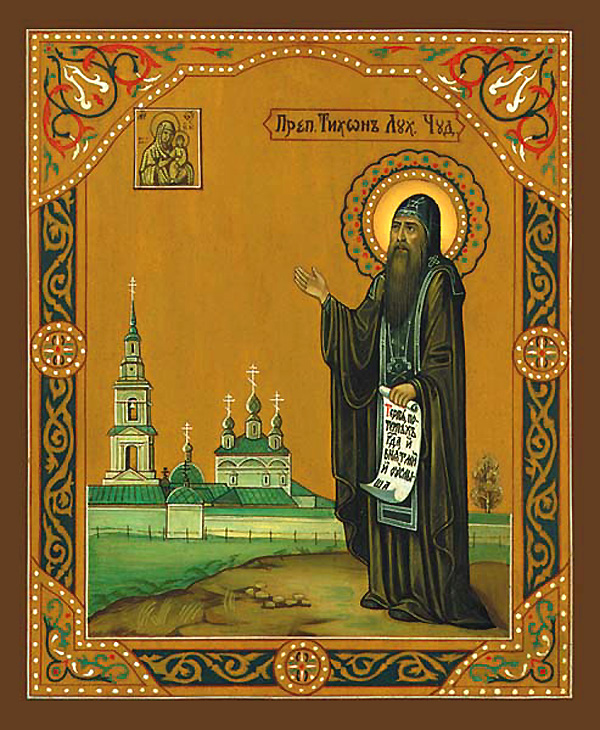 Свети преподобни Тихон, луховски чудотворац Преподобни отац наш Тихон беше родом из Мале Русије, из Литовског краја, и служаше тамо у војсци. Не подносећи насиља од латина, он се пресели у царствени град Москву и стаде тамо водити побожан живот. Касније он раздаде сиротињи све своје имање, замонаши се и настани поред реке Лухе. Ту он основа скит, сабра ученике и стаде се богоугодно подвизавати у посту и молитви. Због велике смирености своје он не прими свештенички чин до саме кончине своје. Дознавши израније о своме одласку к Богу и упутивши ученике своје у свему што им је могло служити на корист душевну, преподобни Тихон престави се у вечне обитељи, 16. јуна 1503. године.
