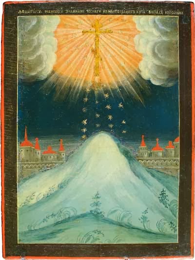 По престављењу првог хришћанског, благоверног и благочестивог цара, светог Константина Великог, на царски престо седе његов син Констанције који нагињаше злочестивој јереси Аријевој, који хуљаше Сина Божјег. Тада се, на посрамљење злочестивих јеретика а на уверење неверника и на учвршћење православних, показа дивно знамење у светом граду Јерусалиму: у дане свете Педесетнице, 7. маја у девет сати пре подне појави се на небу Часни Крст Господњи, који сијаше неисказаном светлошћу, јачом од сунчане. Сав народ, и верни и неверни, у великом страху и дивљењу посматраху то небеско знамење. Часни Крст се простирао над Голготом па све до изнад Горе Маслинске, удаљене петнаест стадија од Голготе. Ширина Часнога Крста одговарала је његовој дужини. А лепота Крста беше као лепота најлепше дуге, те привуче на себе погледе свију. И сви напустише своје послове, било ручне или домаће и, изишавши из кућа, са пажњом и страхом посматраху то пречудно знамење. Затим многољудне гомиле Јерусалимљана, испунивши се страха и радости од овог божанственог виђења, са великим умилењем и усрдношћу похиташе у свету цркву; ту беху старци и младићи, мужеви и жене са одојчади, такође и неудате девојке, и људи свакога узраста и звања, путници и иностранци, хришћани и иноверци, - сви они хитаху к цркви, једнодушно и громогласно прослављајући Исуса Христа, Господа нашег, Сина Божјег јединородног, Бога истинитог од Бога истинитог, чинитеља великих чудеса.Тада се неверници и јеретици, непријатељи и хулитељи Христовог Божанства, испунише стида, видећи у појави Крста тако велику божанску славу и силу Господа Христа. И на тај начин сама стварност посведочи тада, да је хришћанска вера - права, истинита и благочестива, и не од виспрених речи спољашње мудрости људске састављена, већ откривењем и силом Духа Светога потврђивана, и небеским знамењима и чудесима посведочавана.О овом чудесном знамењу патријарх јерусалимски Кирил написа писмо цару Констанцију, саветујући му да приђе Православљу. А Созомен пише да због ове појаве светога Крста на небу врло многи Јевреји и незнабошци повероваше и, приступивши с покајањем Христу Богу нашем, примише свето крштење. И сви они побожно слављаху Христа Бога нашег, једносушног и савечног Оцу и Светом Духу. Ми пак, исповедајући неисповедиву силу његову, јављену Крстом, величамо својим похвалама Господа Бога нашег, и клањамо се подножју ногу његових - Крсту светом, молећи благост Господњу да нас при другом страшном доласку свом Господ Христос удостоји видети у радости и нади спасења знак Сина Човечијег (Мт. 24, 30), свети Крст, који ће се онда јавити на небу, и да нам њиме као кључем отвори двери Царства Небеског, као некада рај разбојнику. И да нас уврсти међу своје благословене овце вавек, амин.Ово јављање Часнога Крста догодило се 7 маја 357 године.