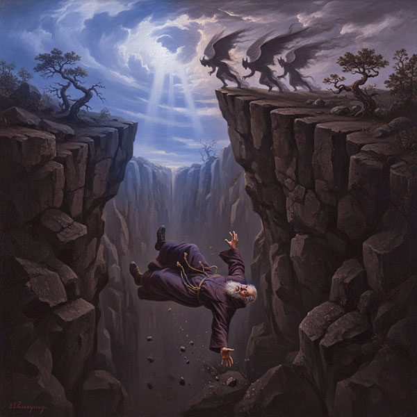 Пустињак је био тако неопрезан да је у разговору с непознатима дошао с њима на најстрмији део стене. И ту га снажан ударац у леђа збаци као јесењи лист с дрвета који је ветар откинуо у бездан, а са стене се зачу звиждук и сатански кикот разлеже се над пустињом.