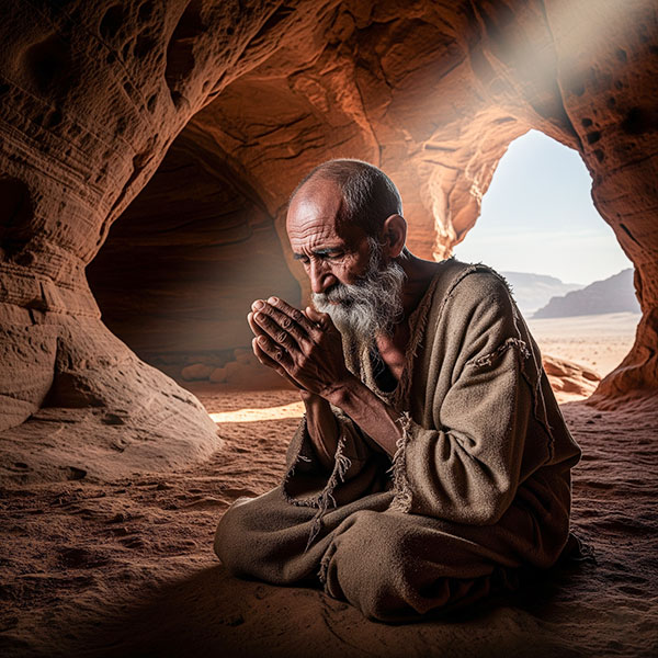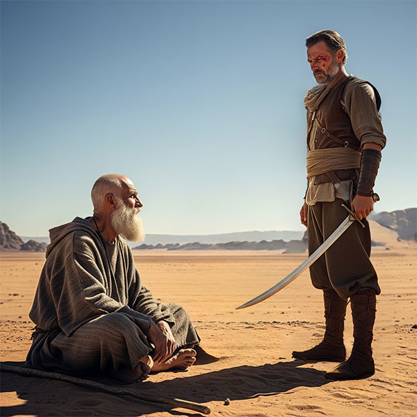 Старац је изашао из келије и кренуо дубоко у пустињу. Песак је шкрипео под ногама, ветар носио самоћу као непрегледно платно, а сунце пржило без милости. И тада, изненада, пред њим се појави лопов, насрнувши с намером да га убије.