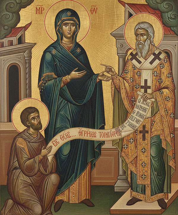 Свети Григорије Чудотворца, епископ неокесаријски је човек који је сопственом усрдном молитвом открио темеље хришћанске догматике. Усред ширења јереси, њему се у чудесном виђењу јављају Пресвета Богородица и Свети Јован Богослов, како би му открили велику тајну. Јеванђелист, по заповести Мајке Божије, предаје Григорију прецизно и непроменљиво учење о Савршеној Светој Тројици, које је потом постало непроцењив темељ вере.