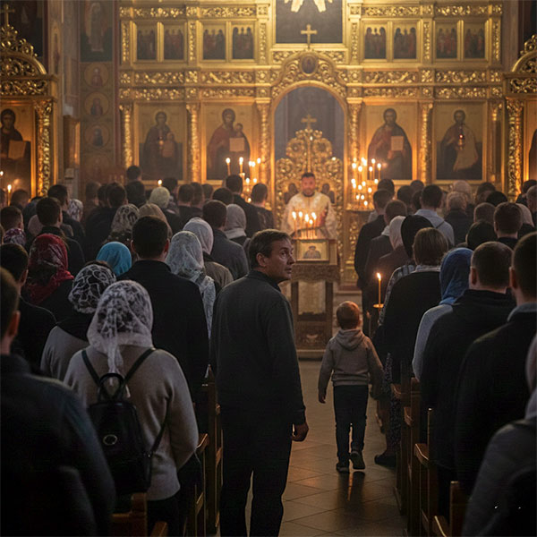 Понекад у цркви пожелимо само да ћутимо. У тој тишини свако од нас се запита: „Ко сам ја? Ко сам ја заиста? Шта радим данас овде у мрачном храму – да ли сам заиста један од оних који траже Бога, или сам се само сакрио међу њих?“ Тада се морамо запитати: куда су заправо усмерене наше очи? Да ли оне кроз сузе и пламен свећа заиста траже Господа, или су загледане само у наше сопствене проблеме? Ова тишина нам даје прилику да признамо да смо се, упркос привидном благостању, ипак изгубили чак и у самом храму.