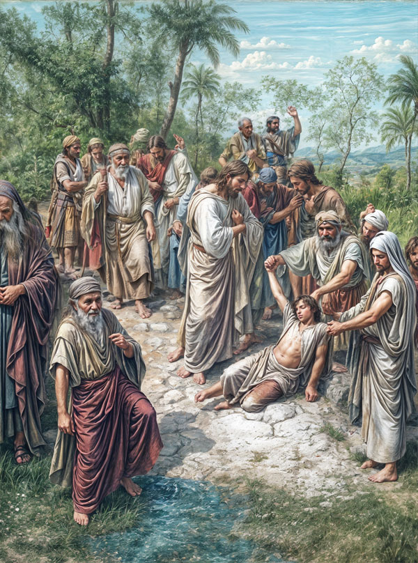 Јеванђелиста Марко представља живописну слику Христовог појављивања пред народом. Он пише да је, када је Христос стигао, велико мноштво људи окружило групу Његових ученика и књижевнике из Јерусалима, који су се међусобно препирали. Расправа је очигледно била оштра и непријатна за ученике. Али Христов долазак прекинуо је свађу.