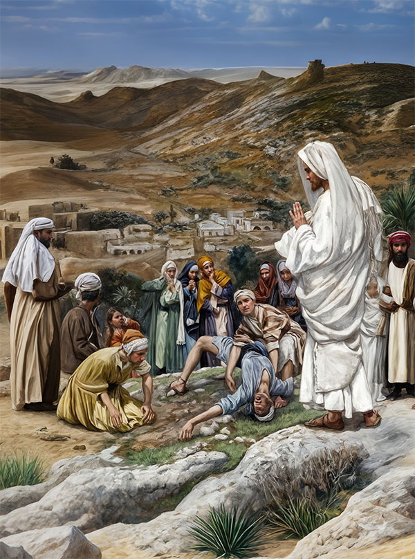 Али док се водио разговор између Христа и дечаковог оца, људи су се и даље окупљали са свих страна да виде необичан призор. Тада Исус запрети нечистом духу говорећи му: „Неми и глуви душе, заповедам ти, изиђи из њега и више не улази у њега!“ А дух повика, и јако га растроји, и изиђе из њега; и он беше као мртав, тако да многи говораху: „Мртав је.“ Али дечак беше жив, и Христос га предаде његовом оцу (Лука 9:42).