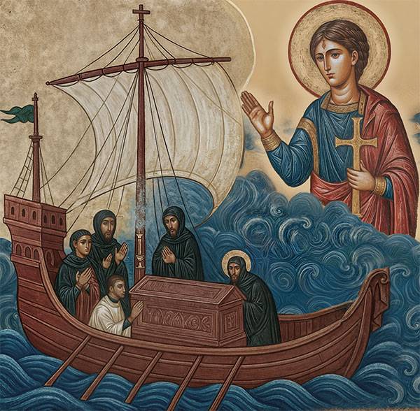 Када су стигли до мора, подигла се страховита бура. Лађа је била на ивици да буде прогутана. Али тада се сам светитељ јавио присутнима и рекао: „Ја сам с вама, не бојте се.“ И море се утишало. Од тог тренутка, није више ковчег био оно што носе, него – Стефан је био онај који води.