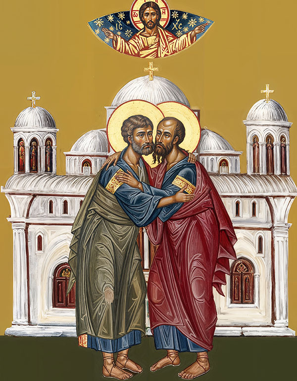 Икона Светих првоврховних апостола Петра и Павла једна је од најпознатијих у хришћанској иконографији. На њој су два стуба Цркве, два велика мисионара и мученика, приказани у братском загрљају. Њихова лица зраче милошћу, достојанством и љубављу. Али — њихов однос, како га описују Дела апостолска и Павлове посланице, није био ни миран, ни једноставан.