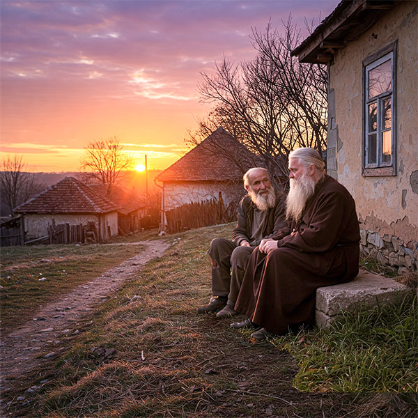 Монах, старији подвижник, враћао се у своју испосницу након неколико дана молитвеног тиховања у планини. Његово лице било је мирно, као да није било у додиру са овим светом, али у његовом срцу – тихо, постојано огњиште љубави.