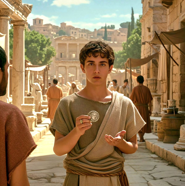 „Не познајем ове људе!", љутито га је прекинуо градоначелник. „Не претварај се да си луд, младићу. Цар приказан на овом новчићу живео је пре скоро две стотине година. А ти тврдиш да си овај новац узео из очеве куће! Колико година треба да има твој отац?! Сто? Двеста?!"