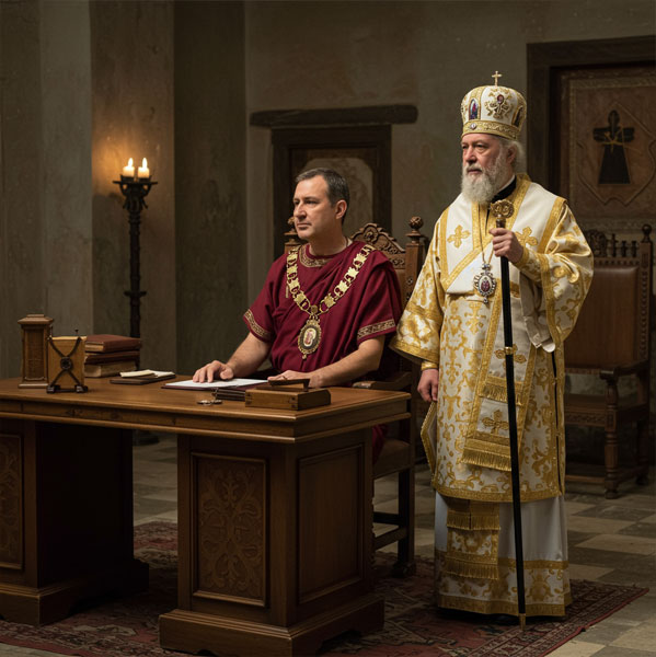 Градоначелник Никифор је већ био обавештен о хапшењу младића са древним новчићем. Пажљиво је посматрао сребрњак, а затим га показао владици Стефану. Владика је збуњено климнуо главом, а затим уперио поглед ка нама.