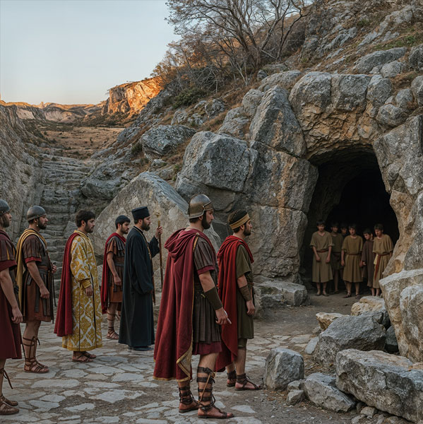 Путовање до пећине било је необично. Градоначелник је седео поред Јамблиха у носилима. Стигли су до пећине у подножју планине Охлон. Улаз је био блокиран великим камењем. Уз помоћ градске страже, брзо су уклонили препреку.