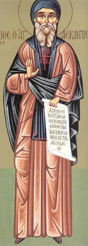 Сшвети преподобни Асклипије и Јаков Асклипије и Јаков преподобни подвизаваху се у петом веку, у време Теодорита епископа Кирског (393-458), у пустињи Сиријској. Асклипије беше ученик преподобног Полихронија, прислужника авве Зевина. Он у свему подражаваше преподобног Полихронија: у храни, одећи, скромном понашању, бдењу и молитвеном општењу с Богом. Ни док се раније налазио међу мирским људима њему није сметало да живи подвижнички и врлински. Преселио се у миру, добивши од Господа дупли венац. Преподобни пак Јаков затвори се у својих деведесет година у једну малену келију покрај села званог Нимуза и никоме се не показиваше. Једино је долазницима давао одговоре кроз једну малу спирално направљену рупу. У келији не запаљиваше ни ватре ни светиљке. Издржавши тако у подвигу лишавања, у миру се пресели ка Господу.