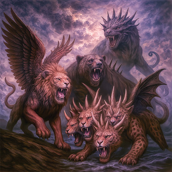Свети Јован Богослов је у виђењу видео две звери, једну како излази из мора, а мора су народи, племена и језици, у облику треће Данилове звери, али са седам глава од којих је једна смртно рањена и чија ће рана бити излечена, са устима лава, дакле Вавилона и ногама медведа, Медиоперсије и са десет рогова на глави, паганског Рима, на којима је десет круна."