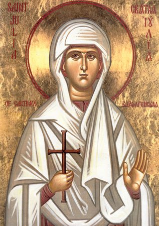 Св. муч. Јулија девица. Родом из Картагене, од знаменита рода. Када Персијанци покорише Картагену, многи народ би одвучен у ропство. И св. Јулија би ухваћена и заробљена и допаде у руке неком трговцу у Сирији. Тај трговац беше незнабожац. Видевши Јулију као хришћанку он је саветоваше више пута да се одрекне Христа и постане једноверна с њим, али Јулија никако на то не пристајаше. Па како Јулија беше верна и поуздана у служби, то је трговац остави на миру и не говораше јој више о вери. Једном трговац натовари лађу робом, Узе Јулију собом, и крете морем у далеке стране ради трговине. Када стигоше на Корзику, беше неки празник незнабожачки, и трговац се придружи скверном жртвоприношењу, а Јулија оста у лађи плачући што толикољуди живе у глупој заблуди и не познају истину. Но некако незнабошци сазнаду за њу, извуку је из лађе, и ако се њен господар томе противио, и почну је страшно мучити. Одсекоше јој груди и бацише на неки камен, а по том распеше је на крст, на коме св. Јулија предаде дух свој Богу. Њена смрт буде објављена ангелом Божјим монасима на оближњем острву Маргарити (или Горгони), и они пређу и чесно сахране тело мученице. Многа чудеса пројављивала су се на гробу св. Јулије кроз векове и векове, а и она се сама некима јављала из онога света. Чесно пострада у VI столећу. После много година хтедоше верни сазидати нову цркву, на једном другом месту, у част свете Јулије, пошто стара црква беше и тесна и оронула. Сабраше, дакле материјал: камен, циглу, песак и остало што треба на том новом месту. Али се догодида ноћу уочи оног дана, када су намеравали темељ положити, сав онај материјал беше невидљивом руком пренет до оне старе црквице. У недоумици људи опет пренеше материјал на оно ново место, но опет се догоди исто: материјал се обрете на старом месту поред старе цркве. И видеше ноћни стражари неку пресветлу девојку како на белим воловима превози материјал ка старој цркви. Из овога разумеше сви, да св. Јулија не жели да јој се црква зида на другом месту, те порушише стару цркву, и на том истом месту подигоше нову.