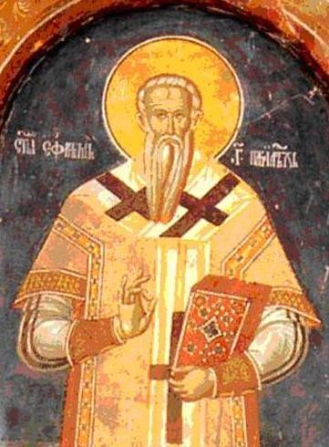 Свети Јефрем, патријарх српски Свети Јефрем би рођен од оца свештеника у близини бугарског града Трнова, у време владавине српског краља Милутина (око 311. године). Још од малена тежио је за духовним и подвижничким животом. Родитељи су хтели да га жене, али Бог осујети њихово телесно мудровање. И то на овај начин: млади Јефрем усни сан у коме му Бог указа како ће остварити своју жељу о монаштву. И Јефрем поступи како му у сну би речено: оде на означено место и нађе старца пустињака по имену Василија, остаде код њега и предаде се подвигу поста и молитве. А беше му тада 23 године. Растући духовно, Јефрем после извесног времена прими монашки, анђелски чин. Но родитељи његови дознадоше где се он налази и хтедоше да га отргну од пустињака и врате дома. Али он побеже у Свету Гору, и тамо се сакри у једном од скитова служећи Богу духом и истином. Но када агарјани нападоше на Свету Гору, пустошећи је, преподобни Јефрем се са неким својим ученицима врати у Србију и настани у Ибарској клисури, где се подвизаваше, али не задуго. Одатле он отиде и, поклонивши се светињама Пећке патријаршије и добивши благослов од патријарха Јоаникија (1346-1354. г.), оде у манастир Дечане, изабра једно пусто и усамљено место, па се ту као строги пустињак подвизаваше, служећи Богу молитвом и постом. И просија у монашком живљењу и врлини.