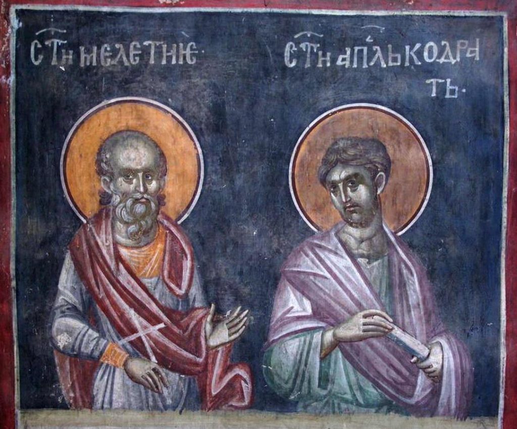 Свети мученик Мелетије за царовања римског цара Антонина беше стратилат; водио је порекло из Галатије. Као хришћанин, он се мољаше Богу да потпуно ишчезне незнабожачка заблуда, Тада демони, видећи своју пропаст, уђоше у псе и стадоше оплакивати своју погибао. Они хођаху свуда, завијајући, и тиме људима уливаху страх. Но свети Мелетије са подручним војницима својим поби их, и поруши незнабожачке храмове. Зато Максимијан, управитељ града у коме се находио свети мученик, нареди да га ухвате, и он га стаде приморавати да принесе жртву идолима, али светитељ не хте ни да чује за то. Тада мучитељ нареди да га бију гвозденим чекићима. После тога светог Мелетија обесише о борово дрво и приковаше га за њега клинцима, од чега он и сконча. Комитима Стефану и Јовану, као и свима војницима који беху под њима, заједно са женама и децом, отсекоше главе мачем. Тако пострадаше за Христа свети мученици, и преселише се у царство Христа Бога.