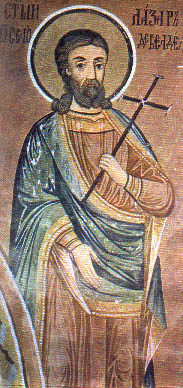 Овај новомученик, Лазар, беше родом Бугарин из Габрова. Као младић остави своје место рођења и оде у Анадолију, то јест на Исток. У неком селу близу Пергама, званом Сома, чуваше Лазар овце. Но као хришћанин изазове гнев Турака против себе, и би бачен у тамницу од некога аге 7. априла 1802. године. После дугих мучења и паљења коже, удова и језика, и разних других нечовечних истјазања, која Лазар јуначки поднесе из љубави према Христу, овај млади мученик би обешен, 23. априла 1802. године, у својој 28.. години. Господ га прими у вечне дворе Своје, и прослави га на небу и на земљи. Над моштима св. Лазара, које хришћани побожно погребоше, догодише се многобројна чудеса, која описа преподобни јеромонах Никифор Хијоски, који му и службу написа.