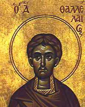У време цара Нумеријана царски намесник Теодор стаде гонити Цркву Божју у граду Егеји, и на разне начине убијаше верне слуге Христове. Тада би ухваћен и осамнаестогодишњи младић хришћански Талалеј, красан изгледом и узрастом телесним, косе плаве, лекар по занимању, који бесплатно лечаше сваку болест. Када би у храму Адријановом изведен пред незнабожни суд, намесник погледавши у њега, зачуди се његовој лепоти, па упита оне око себе: Где ухватисте овог дивног младића? Они му одговорише: Идући у град Аназар Киликијске области, ми га видесмо где иде испред нас, па кад нас примети он се брзо сакри у шуму. Ми га онда брижљиво тражисмо, и једва га нађосмо где седи под дивљом маслином; везасмо га, и ево доведосмо к теби на суд.Намесник упита Талалеја: Реци нам, младићу, које си вере, из кога града, од каквих родитеља, и како се зовеш? Талалеј одговори: Хришћанин сам, име ми је Талалеј, родом сам из Ливана, отац ми Верукије беше војвода, мајка ми се зове Ромилија, имам и брата који припада црквеном клиру у чину ипођакона, ја сам лекар, изучио сам лекарску вештину код учитеља Макарија архилекара. Када због гоњења од стране идолопоклоника сви хришћани који живе у Ливану побегоше у горе и пустиње, ја бих ухваћен и приведен к Едеском намеснику царском Тиберију. Мучен од њега, ја исповедих име Оца и Сина и Светога Духа, Бога истинитог и свеблагог, Творца свега, и помоћју Господа мог бих избављен из мучитељевих руку и побегох. А сада, опет ухваћен, налазим се у твојој власти. Чини са мном што хоћеш, јер треба да умрем за Христа, небеског Бога, Спаситеља мога.Намесник га упита: Надаш ли се, бедниче, да побегнеш из мојих руку, као што си побегао из Тиберијевих? Светитељ одговори: Немам више намеру да бежим, јер верујем Господу мом Исусу Христу, и надам се у Њега, да неће допустити да се осрамотим, него ће ми помоћи да до краја претрпим муке.У близини стајаху два џелата, Александар и Астерије. Њима намесник нареди да Талалеју сврдлом проврте глежње на ногама, провуку коноп кроз пробушене кости и главачки обесе. Но џелатима сила Божја одузе вид, те место Талалеја они провртеше једну даску и обесише о дрво. А један од хришћана, ученик светог Талалеја, по имену Тимотеј, који стајаше тамо и посматраше све шта се догађа, климну светитељу главом, говорећи: Видиш ли шта они раде? Светитељ му одговори: Ћути, брате; са мном је Христос који ми помаже.А намесник, погледавши, виде не мученика него даску где виси о дрвету, па упита џелата: Шта сте то урадили? Не наредих ли вам да човека обесите, а ви сте обесили даску. - И разјарен, мислећи да му се џелати ругају, намесник нареди да их обојицу бију без милости. А они бијени, викаху: Жив нам Господ, од сада и ми постајемо хришћани, јер верујемо у Христа, и страдамо за Њега!Чувши то, намесник нареди да их сместа мачем погубе. И они, скончавши мученички, добише венце од Христа Бога заједно са осталим светим Мученицима. А светоме Талалеју намесник рече: Принеси боговима жртву, па ћеш остати у животу и наслађиваћеш се сластима овога света. Мученик одговори: Нећеш убедити слугу Христовог да принесе жртву демонима.Тада намесник, бесан од јарости, хтеде сам да сврдлом проврти глежње мученику, али кад покуша да устане са седишта, не могаде, јер као да беше прирастао за седиште. А сви идолопоклоници, присутни у Адријановом храму, видевши шта се догоди, громоглас