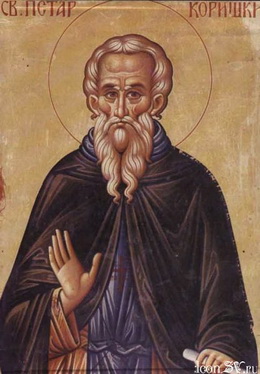 Када Српска земља и народ који живи у њој прими светлост Христовог Еванђеља, и када се апостолским делима и подвизима богоносног оца нашег Саве и осталих богоугодника српских учврсти благочешће међу Србима, тада засијаше многи богоугодни светилници по Србији и читавом Балкану. Међу таквим подвижницима особито се прослави овај преподобни и богоносни отац наш Петар, који се подвизаваше у Коришкој пустињи крај Призрена. Његов живот и подвиге описа хиландарски монах Теодосије (писац и житија Св. Саве Српског), који је на позив коришког монаха Григорија долазио у Призрен и околину и од веродостојних сведока и монаха очевидаца дознао за свети живот и богоугодне подвиге и чудеса овога преподобног. Мудри Теодосије је потом написао и службу преподобном Петру Коришком.Богоносни отац наш Петар беше родом из хвостанског краја у области Диоклитији, како се онда звала покрајина око данашње Пећи. Село његово зваше се Уњемир, а то је данашњи Ујмир крај Пећи. Родитељи му беху побожни и честити хришћани, који га по рођењу крстише и дадоше да се учи светим књигама. Још у младости блажени Петар испољаваше благодат Божју која беше и која имаше бити на њему, јер од детињства беше кротак и смеран, безлобне душе и незлобива ума. Због овога он избегаваше дечје игре и све некорисне дружбе и забаве, што родитеље његове не мало жалошћаше. Уместо свега другога Петар се усрдно труђаше у посту, молитви и похађању храма Божјег, и у учењу божанствене науке речи Божје. Из Светога Писма он схвати да ради љубави Божје треба оставити све на свету, па и саме родитеље, и зато му душа жуђаше да се посветн служењу Богу у самоћи и отшелништву. Када му ускоро умре отац он беше готов да се удаљи из дома и света, али га мајка преклињаше да њу и млађу сестрицу, коју имаше, не оставља самотне и сироте. Преподобни се смилова на мајчина преклињања и преузе на се управљање кућом, али своје подвиге поста и молитве не умањи него их напротив удвостручи. Он кротко ораше своју њиву на једном слепом волу, који по смрти преподобнога на чудесан начин препознаде палицу свога господара. Уз тело своје преподобни ношаше грубу власеницу, и то нико не знађаше осим мајке која беше приметила његово нагло телесно слабљење. Али се мајка бојаше да му ишта примети, из страха да их не остави и оде у пустињу. Но ускоро се и мајка пресели ка Господу, те преподобни могаше испунити своју давнашњу богоугодну жељу.Оставши сам са младом сестром својом, блажени Петар је питаше хоће ли да се уда, јер је не могаше оставити тако младу и незбринуту. Но сестра такође љубљаше девственост и чистоту, и не жељаше да остави брата него га мољаше да и њу узме са собом, обећавајући му да ће се подвизима његовим поста и молитве и она подвизавати. Тада јој он смирено рече: "Воља Господња нека буде!" Затим изађе са сестром из свога села и у цркви светих Апостола Петра и Павла, недалеко од села, прими монашки постриг од једног старца монаха који је у тој цркви живео. Ту преподобни сагради посебне келије себи и сестри, где се обадвоје подвизаваху у посту и молитви. Подвизавао се преподобни врло тврдо и истрајно, и у тешкој борби с демонским искушењима показао се победоносним, као што ће се даље показати. Њима двома долажаху сродници и познаници и доношаху им што им беше потребно за живот, но блажени Петар не беше тиме задовољан и предложи сестр