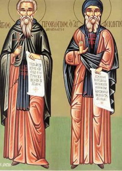 Свети преподобни Прокопије Декаполит Светитељ Прокопије беше родом из Десетограђа (Декаполиса) око мора Галилејског, због чега се и прозват Декаполит. Овај крај се спомиње у Еванђељу светога Марка: Дође Исус на море Галилејско у крајеве Десетоградске (Мк. 7, 31). Преподобни Прокопије се у младости одаде испосничком животу монашком и прође све прописане трудове, којима се чисти срце, и украси себе савршеном чистотом, и беше знаменит међу преподобним оцима. Но појави се иконоборачка јерес, чији први проналазач беше зли цар Лав Исаврјанин. Та јерес лажно називаше идолопоклоницима оне који поштују свете иконе и клањају им се. И нечестиви цар неправедно и немилосрдно убијаше многе православне, а све раније православне цареве и архијереје и знамените хришћане, који су се побожно клањали светим иконама, он предаваше проклетству, иако сам проклет од свију. Тада овај велики и непоколебљиви стуб побожности и силни заштитник правоверја, Свети Прокопије, храбро устаде против јеретика, који су безбожно хулили оваплоћење Бога Слова и бестидно одбацивали Христов човечански лик, на иконама сликан. И посрамљиваше јеретике, изобличавајући њихово безумно умовање, и побећујући их непобедивим богонадахнутим речима. И њихова превиспрена причања кидаше као паучину. Због тога изазва против себе гнев звероименог и звероподобног цара, који као лав који је изишао из пустиње рикаше, тражећи кога да прогута. И по наређењу царевом преподобни би ухапшен и жестоко бијен. Затим му гвозденим справама љуто стругаше цело тело, па га у мрачну и смрдљиву тамницу вргоше. Налазећи се у оковима, он великодушно поднашаше све патње, имајући у свима својим страдањима другара и састрадилника, Преподобног Василија, који му раније и у испосништву беше заједничар и љубазни сажитељ. Са њим он, после многих рана задобијених за свете иконе, дуго је тамновао, све до пагубне кончине насилникове.А када безбожни цар Лав би лишен привременог, и уједно с тим, и вечног живота, пошто умре и телом и душом, тада Свети Прокопије са својим састрадалником Светим Василијем, и са другим светим и преподобним оцима, би пуштен из окова и тамнице на слободу. И остатак живота свог проведе у својим уобичајеним испосничким трудовима, упућујући многе на врлину, и приводећи их спасењу. Потом у дубокој старости отиде ка Христу Господу, да гледа његово лице не на икони него у стварности, и да за трудове своје прими двоструку награду: као испосник, и као Христов страдалник који се за свете иконе борио до крви.Скончао мирно почетком деветог века.