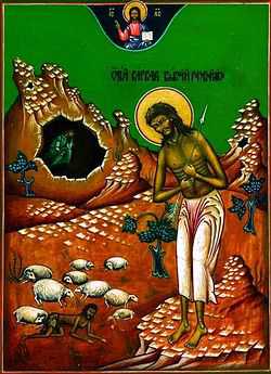Овај преподобни беше родом из крајева Пентапоља у Африци, беше црн по изгледу и беше разбојник. Отишавши у западне крајеве на бродовима, он тамо многе опљачка и многа друга зла учини људима. Поставши затим и старешина разбојничке банде, јер беше веома јак, он убијаше хришћане и чињаше путеве у оним крајевима непролазним за мирне људе. По промислу пак Божјем он једном остаде насамо и поче размишљати о својим поступцима и неделима. Савест му се пробудила и указивала му на страшни час Суда Божјег и на вечна мучења.