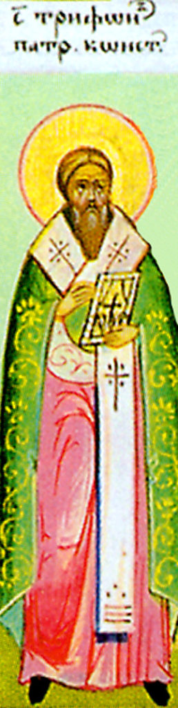 Свети Трифун патријарх Цариградски У цара Романа, који владаше Византијам дочетком десетога века, беше син Теофилакт од шеснаест година када умре патријарх Стефан. Цар хтеде тога свога сина узвести за патријарха, јер га беше заветовао духовном звању још од малена, али због малолетства не могаше то учинити пошто црквени канони то забрањиваху. Престо патријаршијски заузе монах Трифун, човек заиста достојан таквог положаја: био је савршен у врлинама и беспрекорног живота. И оста Трифун на престолу три године. Када син царев уђе у двадесету годину, намисли цар пошто-пото уклонити Трифуна и свога сина довести за патријарха. Светитељ Божји Трифун не хтеде се добровољно уклонити с престола не због чега другог него једино због тога што сматраше за велику саблазан, да се тако млад човек уздиже на тако одговоран и тежак положај као што је патријаршиски, који захтева човека зрела по годинама и по памети, доброга зналца Светога Писма и способна да управља Црквом како треба.Цар Роман беше на муци не знајући шта да ради, јер није било ниједног разлога, због кога би могао уклонити с престола патријарха Трифуна. Јер преподобни Трифун беше свет по животу, и не беше у њему никаквог порока. Тада притече цару у помоћ епископ кесаријски Теофан. Пријатељ царев, а лукав, он рече цару: Царе, ослони се на мене за ову ствар, и ја ћу све уредити по твојој царској жељи. Цар се веома обрадова овоме предлогу, и замоли га да то сврши што пре.Теофан оде до свјатјејшег патријарха Трифуна, поразговара с њим благо, показујући му се тобож веран пријатељ. И лукаво му говораше овако: Владико, цар је силно огорчен на тебе, и са својим једномишљеницима кује планове против тебе, и сви траже кривицу због које би те збацили с престола. Иако се много паште око тога, све им је узалуд, јер траже кривицу против невинога. Само ти једну ману налазе: кажу да ниси писмен и не умеш да пишеш. И због тога сматрају да си недостојан патријаршијског престола. Зато је неопходно потребно да их посрамиш и уста им запушиш, да би умукнули. Ако хоћеш да ме по слушаш, ти уради ово: пред целим сабором напиши на чистој хартији своје име и патријаршиско звање, и то пошљи цару, да се посраме они који те клеветају како тобож не умеш да пишеш, и тако умукну њихова лажљива уста.Блажени Трифун, будући незлобив, не прозре лукавство Теофаново, и његов му се предлог учини добар. А кад се састаде сабор, патријарх рече свима: Божански саслужитељи, они који хоће да ме неправедно збаце с престола, узалуд се труде да нађу разлог за то. Ја се уздам у Бога мог, да они, ма колико се трудили, не могу наћи кривицу на мени, због које би ме могли лишити Богом ми повереног престола. Сад су измислили клевету, како сам тобож неписмен, па не умем ни да пишем. Ево, ја ћу пред свима вама написати нешто, и кад клеветници то виде, постидеће се и престаће да ме клеветају.Рекавши то , блажени узе чисту хартију и пред очима свију написа ово: Трифун, Божјом милошћу, архиепископ Цариграда - Новога Рима, патријарх васељенски. Написавши то, он ту хартију посла цару. Добивши ту хартију, цар, по савету епископа Теофана, нареди да се изнад патријарховог потписа на тој хартији напише ово: Ја Трифун уступам патријаршиски престо не због чега другог већ само због тога што сматрам да сам недостојан таквог положаја.Када то би урађено, цар нареди да се та хартија прочита пр
