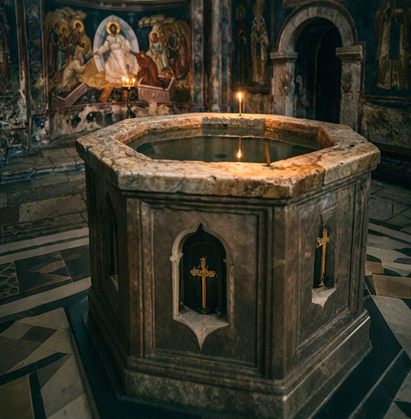 Зато старе православне крстионице нису квадратне ни округле. Оне су осмоугаоне. То није случајна замисао архитекте. То је порука у камену: онај ко овде уђе и крсти се, прелази из света седам у свет Осмог дана. Умире за пролазно, рађа се за непролазно. Кад следећи пут видимо осмоугаони торањ или стару крстионицу, знајмо да то није само лепота. То је нечији начин да каже: и ми можемо да изађемо из круга.