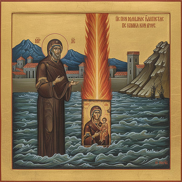 Неколико векова касније, монаси Иверског манастира на Светој Гори видели су са обале нешто необично: икону која је стајала вертикално на мору, а изнад ње је горео стуб пламена. Покушали су да јој се приближе чамцем – икона се одмицала. Тек кад је монах по имену Гаврило Светогорски, пустињак чувен по скромном животу, добио у виђењу поруку да изађе по њу. И он је једноставно закорачио на пучину, а море га је држало као чврста земља док му икона није сама дошла у руке. То није опис који трпи логичка појашњења – то је догађај који стоји у летописима као чињеница пред којом разум стаје.