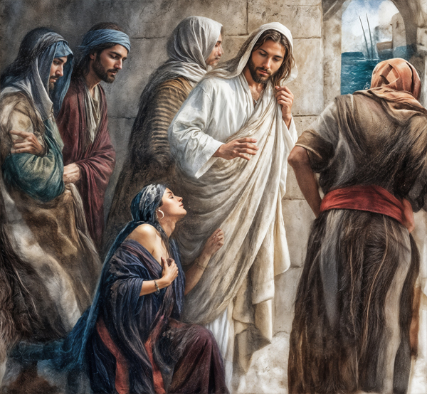 Сличан пример моћне вере пружа нам жена која је дванаест година боловала од крвоточења. Према јеврејском закону, сматрана је нечистом, изолованом од заједнице. Ипак, њена вера је била толико велика да се, упркос болести и Закону, пробила кроз гужву и дотакла крај Христове одеће. Знајући да по Закону чини нечистим онога кога дотакне (и вероватно је дотакла многе док се пробијала), плашила се да открије своју муку. Али додир Христа је њу очистио, а Њега није оскрнавио. Када је Исус упитао ко Га је дотакао, учинио је то да би је подстакао да посведочи о чуду. У страху и трепету, пала је пред Њега, али је чула утешне речи: „Не бој се, кћери, вера твоја спасла те је“ (Лк 8, 48). Ако је овакву веру имала жена са телесном болешћу, колика је тек могла бити вера оних са болесном душом?