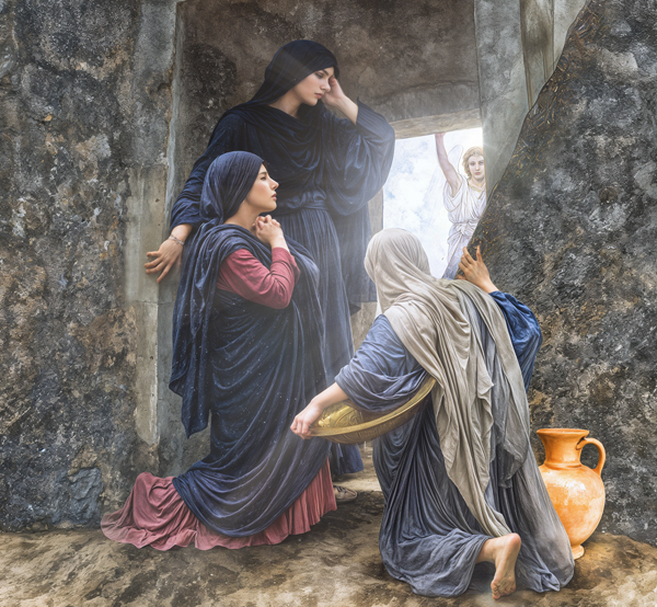 Покушавајући да сложимо коцкице: жене су прво пратиле Јосифа и Никодима до гроба, затим припремиле мирисе, па поштовале суботњи одмор. У суботу увече или рано у недељу, Марија Магдалина је дошла до гроба, видела померен камен и одмах обавестила Петра и Јована. Када су они отишли, Господ се прво јавио њој. Чим је она отрчала да јави ученицима, на гроб су стигле Јована и друге жене, где им је анђео објавио Васкрсење.