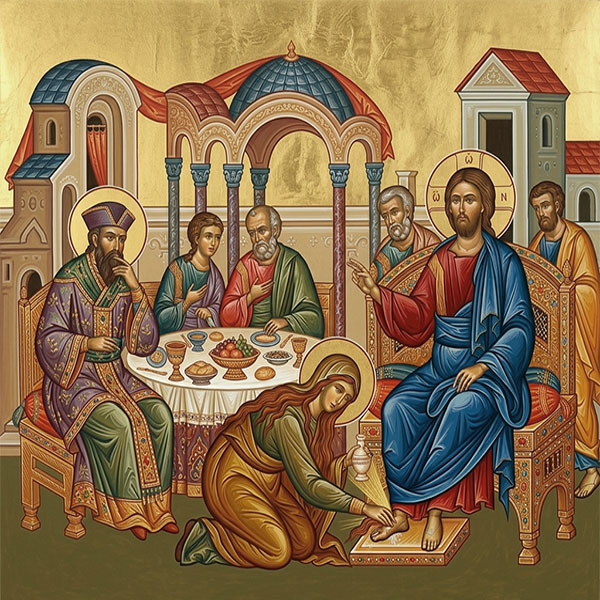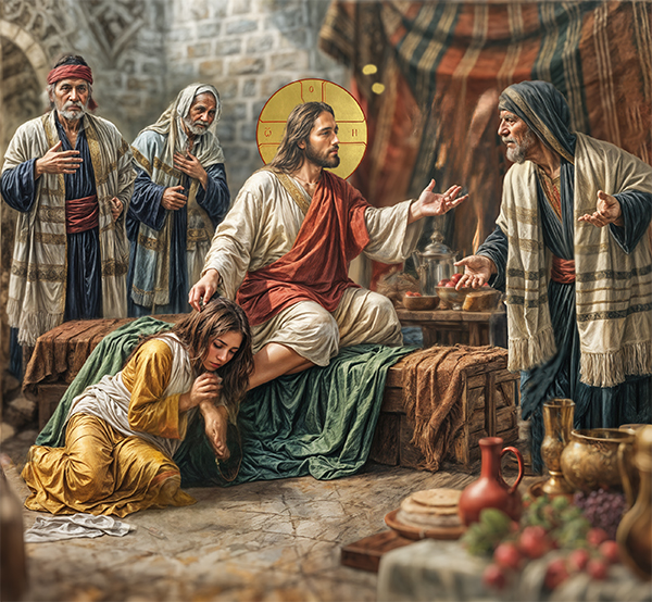 У дом Симона фарисеја одважно је ушла жена позната као грешница (могуће блудница, судећи по контексту сличних прича, нпр. Јн 8, 7). Чула је да је тамо Онај Који опрашта грехове. Дошла је не тражећи ништа, сматрајући себе недостојном опроштаја, желећи само да Га види. Навикнута на презир, није се усудила да Му се обрати. Понизно је села код Његових ногу и слушала. Док је Исус говорио, постајала је свесна тежине свог грешног живота. Са тим сазнањем, родила се и вера. Потоци суза потекли су из њених очију и квасили Христове ноге, а она их је брисала својом косом. Видевши да се Господ не буни, охрабрила се, целивала Му ноге и помазала их скупоценим миром.
