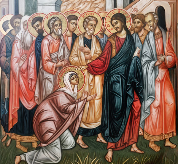 Још више задивљује вера коју је показала жена из хананејског племена, странкиња и незнабошкиња. Угледавши Спаситеља, завапила је: „Помилуј ме Господе, Сине Давидов, кћер моју много мучи ђаво!“ (Мт 15, 22). Молила је милост за себе, јер је патња њене кћери била и њена патња. Исус јој у почетку није одговорио, а затим ју је наизглед одбио, упоредивши је са псом коме се не даје хлеб намењен деци. Међутим, ова жена се није увредила понижавајућим поређењем. Напротив, охрабрила се што уопште разговара са њом, па је одговорила: „Да, Господе, али и пси једу од мрва што падају са трпезе господара њихових!“ (Мт 15, 27).